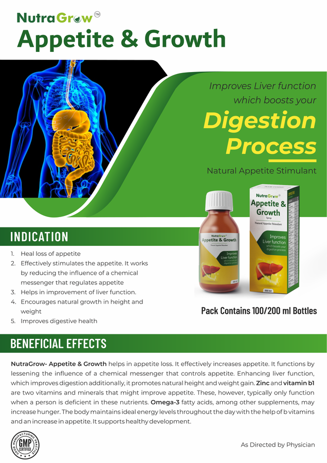 NutraGrow- Appetite & Growth helps in appetite loss. It effectively increases appetite. It functions by lessening the influence of a chemical messenger that controls appetite. Enhancing liver function, which improves digestion additionally, it promotes natural height and weight gain. Zinc and vitamin b1 are two vitamins and minerals that might improve appetite. These, however, typically only function when a person is deficient in these nutrients. Omega-3 fatty acids, among other supplements, may increase hunger. The body maintains ideal energy levels throughout the day with the help of b vitamins and an increase in appetite. It supports healthy development.
