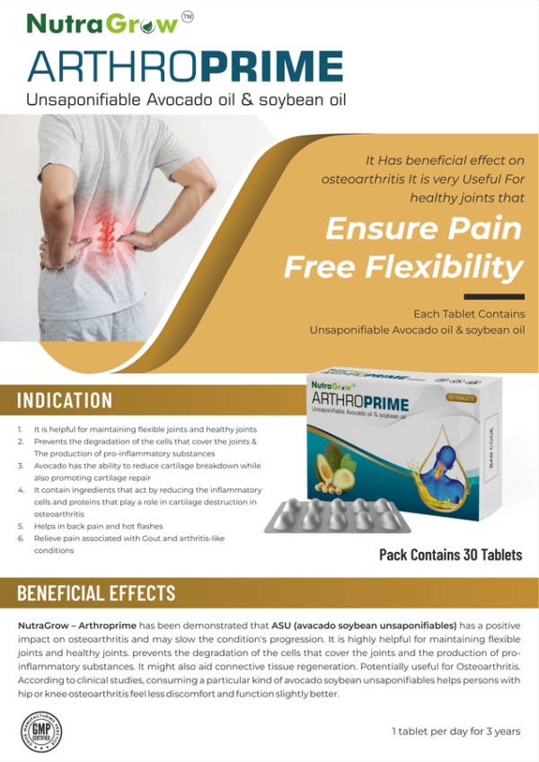 NutraGrow – Arthroprime has demonstrated that ASU (avocado soybean unsaponifiable) has a positive impact on osteoarthritis and may slow the condition’s progression. It is highly helpful for maintaining flexible joints and healthy joints. prevents the degradation of the cells that cover the joints and the production of pro-inflammatory substances. It might also aid connective tissue regeneration. Potentially useful for Osteoarthritis. According to clinical studies, consuming a particular kind of avocado soybean unsaponifiables helps persons with hip or knee osteoarthritis feel less discomfort and function slightly better.