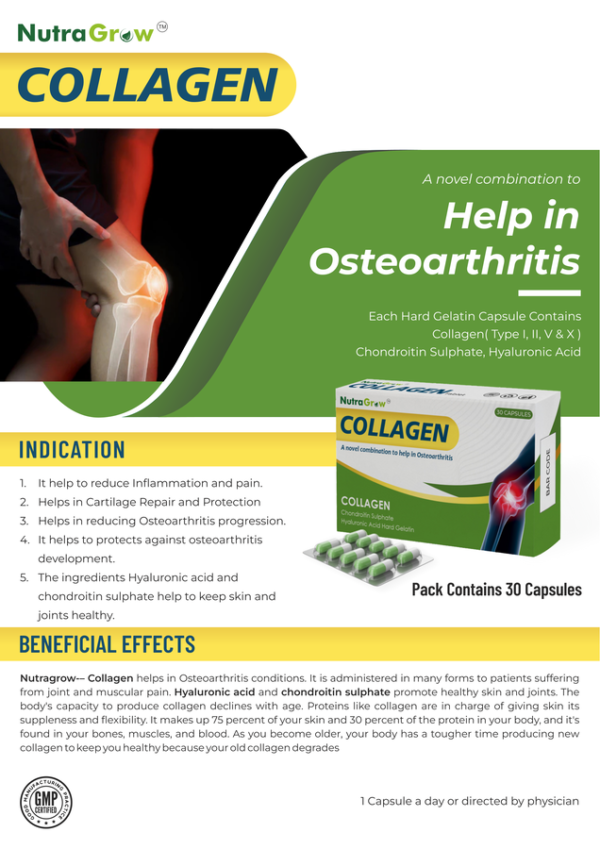 Nutragrow-– Collagen helps in Osteoarthritis conditions. It is administered in many forms to patients suffering from joint and muscular pain. Hyaluronic acid and chondroitin sulfate promote healthy skin and joints. The body’s capacity to produce collagen declines with age. Proteins like collagen are in charge of giving skin its suppleness and flexibility. It makes up 75 percent of your skin and 30 percent of the protein in your body, and it’s found in your bones, muscles, and blood. As you become older, your body has a tougher time producing new collagen to keep you healthy because your old collagen degrades