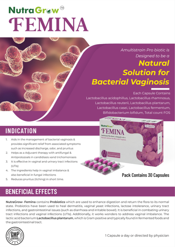 NutraGrow- Femina contains Probiotics which are used to enhance digestion and return the flora to its normal state. Probiotics have been used to heal dermatitis, vaginal yeast infections, lactose intolerance, urinary tract infections, and gastrointestinal issues (such as diarrhea and irritable bowel). It is beneficial in combating urinary tract infections and vaginal infections (UTIs). Additionally, it works wonders to address the vaginal imbalance. The lactic acid bacterium Lactobacillus plantarum is Gram-positive and typically found in fermented foods and the gastrointestinal tract.