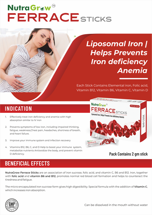 NutraGrow Iron Sticks is an association of iron sucrose, folic acid, and vitamins C, B6 and B12. Iron, together with folic acid and vitamins B6 and B12, promotes normal red blood cell formation and helps to counteract the tiredness and fatigue.