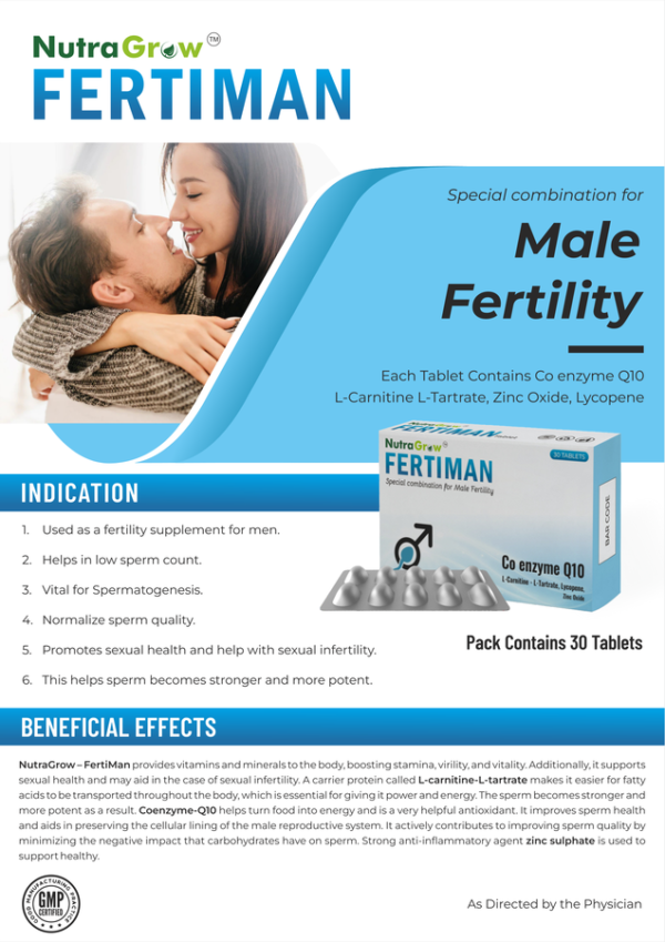 NutraGrow – FertiMan provides vitamins and minerals to the body, boosting stamina, virility, and vitality. Additionally, it supports sexual health and may aid in the case of sexual infertility. A carrier protein called L-carnitine-L-tartrate makes it easier for fatty acids to be transported throughout the body, which is essential for giving it power and energy. The sperm becomes stronger and more potent as a result. Coenzyme-Q10 helps turn food into energy and is a very helpful antioxidant. It improves sperm health and aids in preserving the cellular lining of the male reproductive system. It actively contributes to improving sperm quality by minimizing the negative impact that carbohydrates have on sperm. Strong anti-inflammatory agent zinc sulphate is used to support healthy.