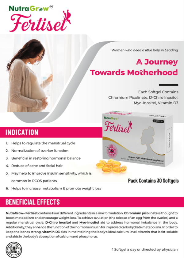 NutraGrow– Fertiset contains Four different ingredients in one formulation. Chromium picolinate is thought to boost metabolism and encourage weight loss. To achieve ovulation (the release of an egg from the ovaries) and a regular menstrual cycle, D-Chiro Inositol and Myo-Inositol aid to address the hormonal imbalance in the body. Additionally, they enhance the function of the hormone insulin for improved carbohydrate metabolism. In order to keep the bones strong, vitamin D3 aids in maintaining the body’s ideal calcium level. the vitamin that is fat-soluble and aids in the body’s absorption of calcium and phosphorus.